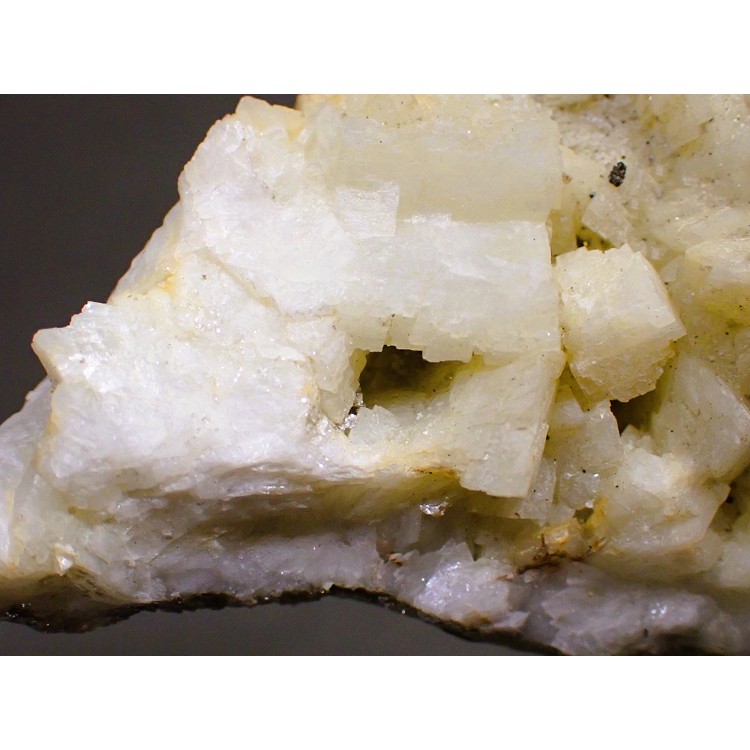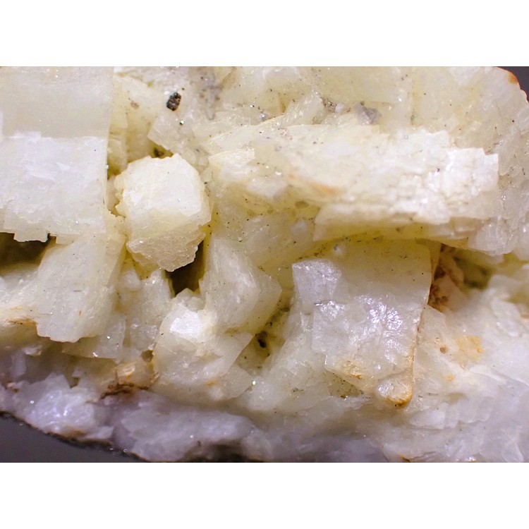 Cream-coloured, well-formed Ankerite crystals with a couple of tiny Pyrrhotite crystals and Calcite. A very bright, glassy luster makes this a particularly aesthetic display specimen.