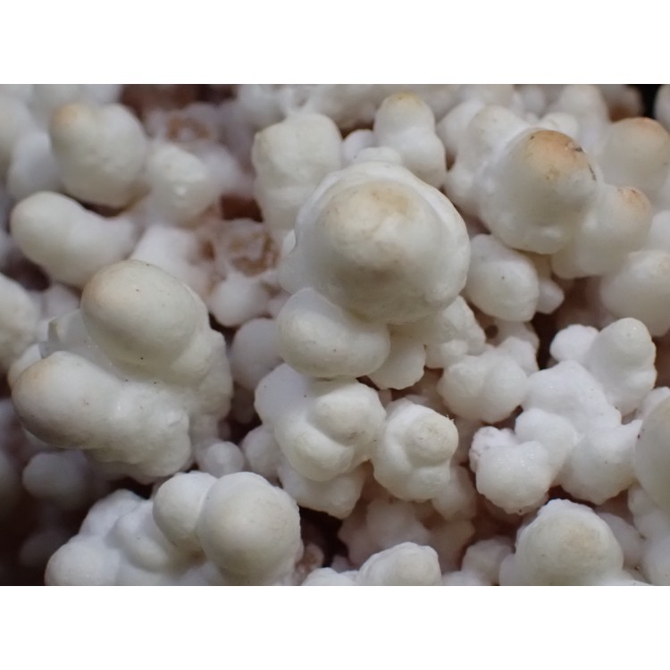 Rounded mamillary protrusions of Calcite covered with a thin layer of Aragonite. The latter has an attractive adamantine luster and a few of the tips are coloured by iron oxides. These types of specimens are sometimes called "Cave Calcite." Specimens of this quality and abundance of undamaged treminations are rare.