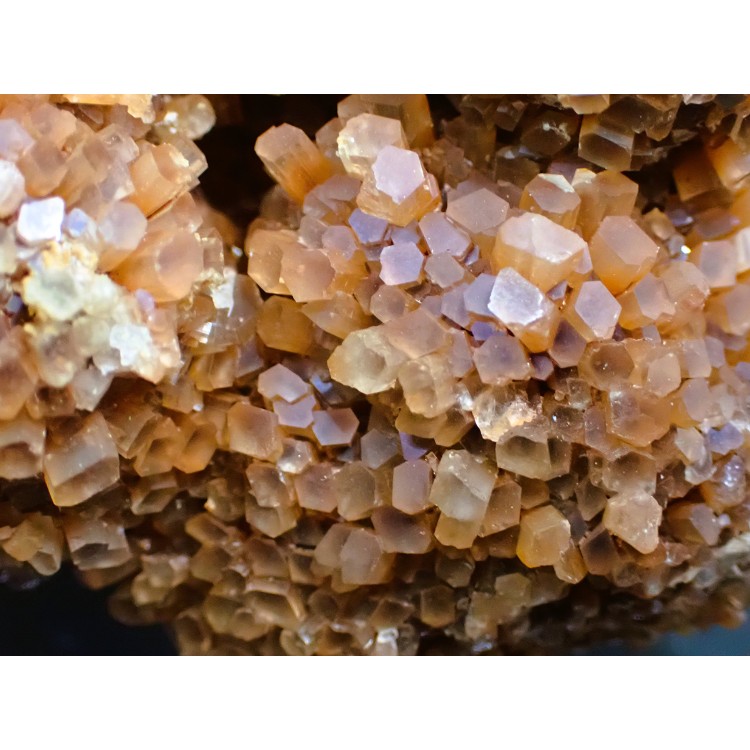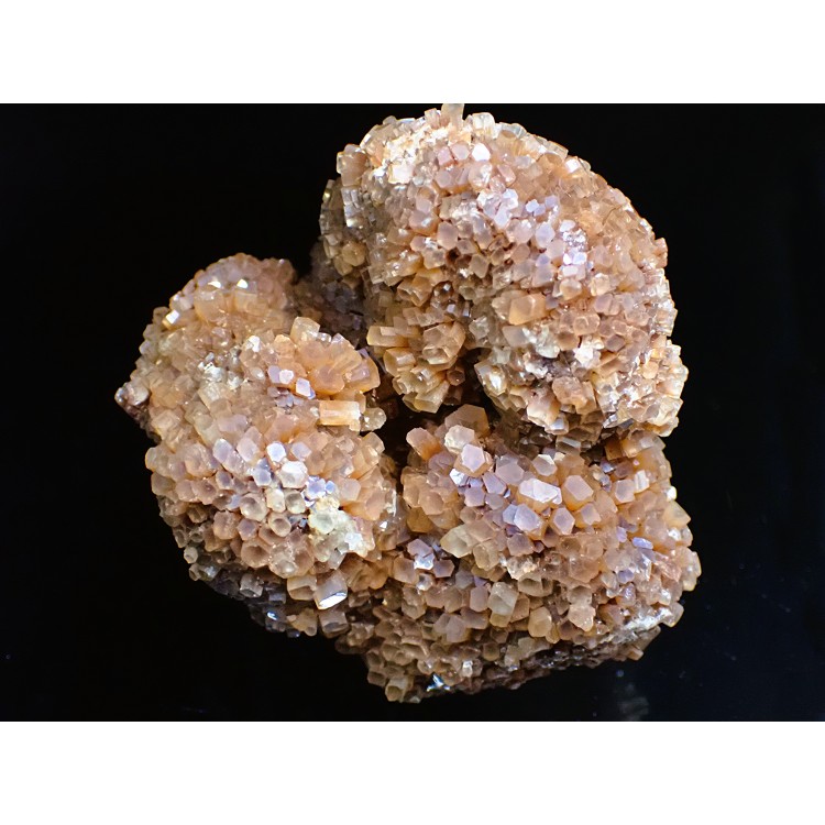 A large cluster of pseudo-hexagonal, reddish-brown, transparent to translucent, terminated Aragonite crystals. The specimen consists of three spherical lobes. all completely covered by lustrous, radiating crystals. The brown colour is caused by iron staining. The crystals are pristine, and for a delicate specimen, there is no damage. A rare example of quality Moroccan Aragonite.