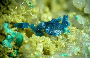 Euchroite - Image Credit: The Assay House, Public Domain The small copper deposit near Kubištová is known for a rich oxidation zone which has yielded a number of striking and highly collectible rare secondary copper carbonate and arsenate minerals. The mineralisation forms a 2 to 6 m thick deposit extending to a depth of 50 m. In addition to common malachite and azurite, it has yielded stunning, emerald-green euchroites; two different forms of olivenite – dark green crystals and white, radial aggregates; blue-green fan-shaped tirolite clusters up to 1.5 cm in size; pale green reniform strashimirite crusts; small, dark blue-green clinoclase crystals; reniform crusts of glassy cornwallite; and recently, blue-green aggregates consisting of a mixture of chalcanthite and melanterite. Crystals of the rare poitevinite have also occasionally been found alongside them. |